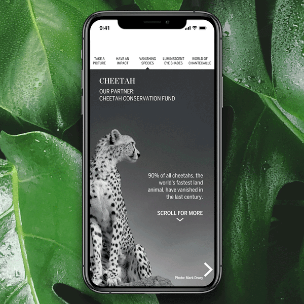 Talk about the elephant in the room. Chantecaille Wild Beauty brings six of Africa’s most gorgeous and endangered wild species—the cheetah, elephant, giraffe, lion, pangolin, and rhinoceros—into your world via Augmented Reality (AR). Each animal inspired an eye shadow in our Luminescent Eye Shades collection, which supports 6 wildlife charities saving species that are in danger of extinction.