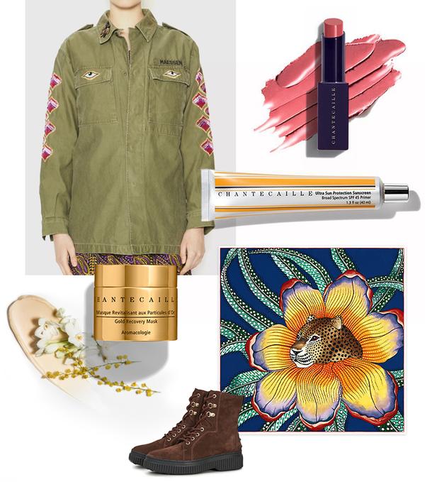 順時針方向先左上: Figue 軍裝外套;花妍柔澤Baobab色調;防曬抗老修護乳液SPF45 PA++;絲巾;Tod’s 短靴;黃金修護面膜。