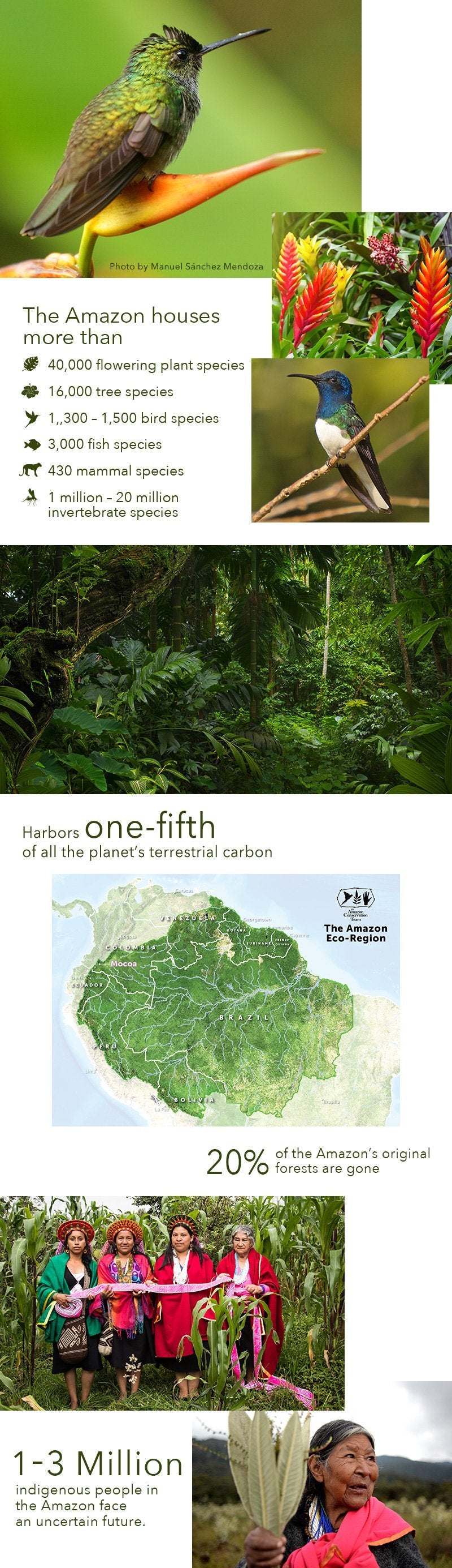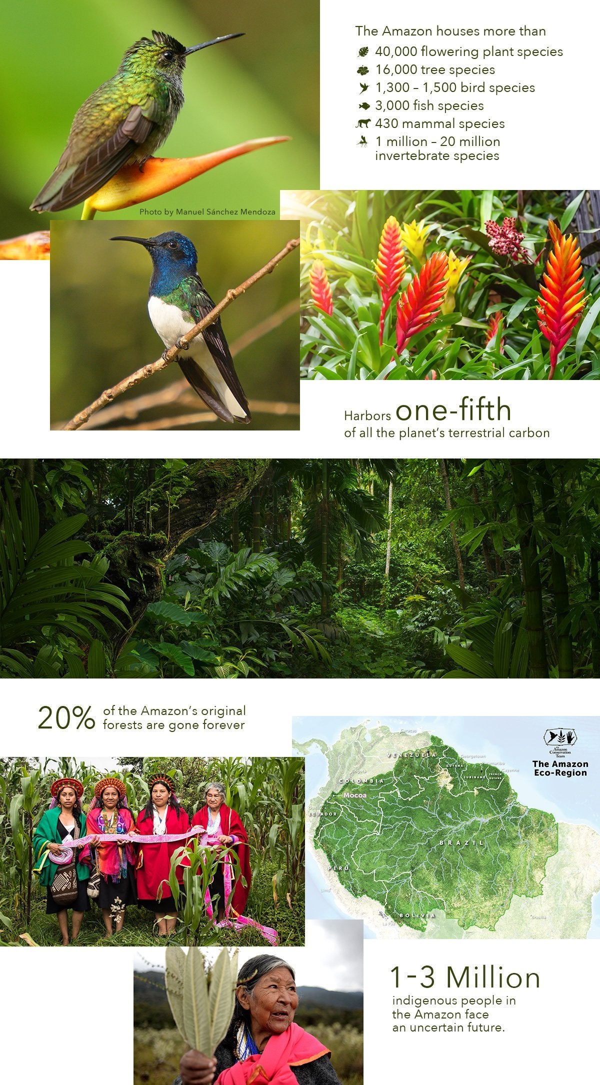 亞馬遜是世界上其中一個最巨大的雨林之一,面積逾600萬平方英里及橫跨9個國家。亞馬遜的樹木為世界供應多於20%氧氣,同時儲存大量碳,有助穩定遠至美國及中國的天氣及降雨量。亞馬遜雨林更孕育世界上四分之一的動植物及藥物原料。
